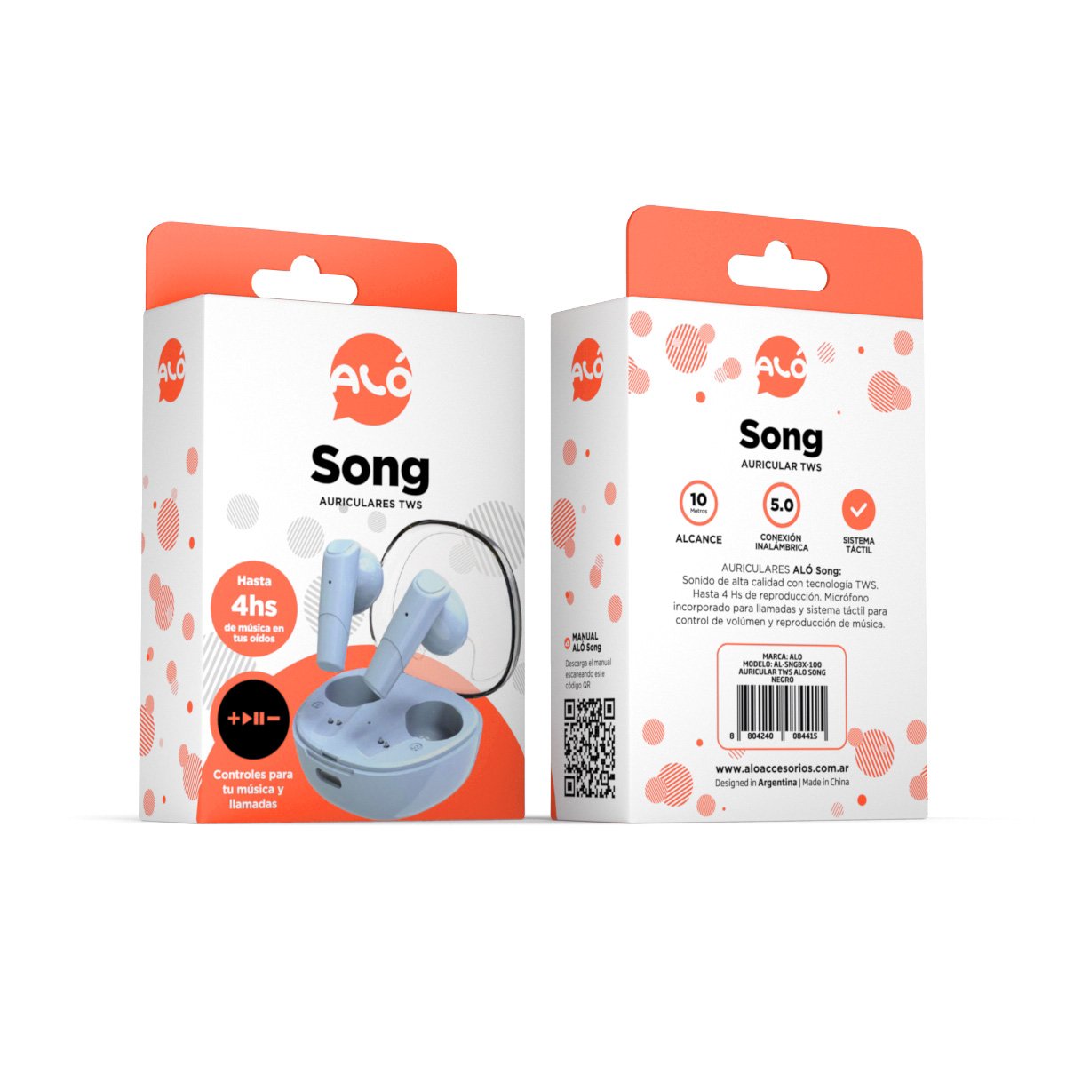Los auriculares TWS Alo Song son un modelo inalámbrico en color rosa con tecnología Bluetooth y con sistema táctil para control de música y llamadas. Viene con estuche de carga que también funciona como power bank y tiene un display de batería para ver el nivel de carga. La duración de la reproducción es de aproximadamente 2.5 a 3 horas, y el estuche ofrece varias cargas adicionales.